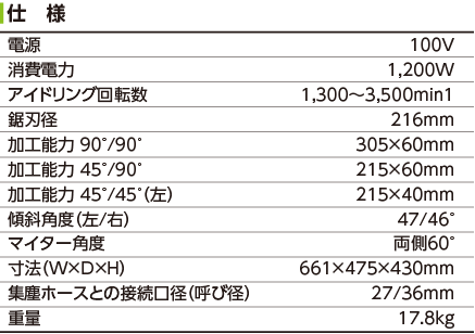 ・軽量かつコンパクトなデザインで運搬が容易。 ・切断能力:厚さ60mm・直角時305×60mm。 ・傾斜角は両側で最大47°/46°、マイター角度は両側で最大60°。 ・スムーズなスライド感で作業の負担を軽減。 ・回転数が変えられるので、どんな複合材料にもマッチし ます。